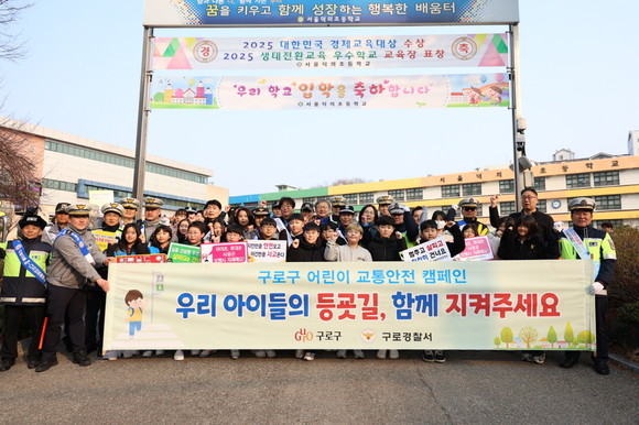 서울 구로구(구청장 장인홍)가 9일 오전 서울덕의초등학교(고척로 213) 일대에서 어린이 교통사고 예방과 어린이보호구역 내 교통안전 의식 제고를 위한 ‘등굣길 어린이 교통안전 캠페인’을 실시했다.