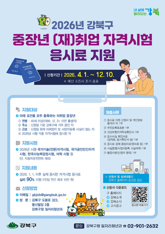 이순희 강북구청장은 “이번 지원사업이 중장년층의 경제적 부담을 덜고 재취업 준비에 실질적인 도움이 되길 바란다”며 “앞으로도 구민의 취업 기회를 확대하고 안정적인 경제활동을 지원하기 위한 정책을 지속적으로 추진하겠다”고 말했다.
