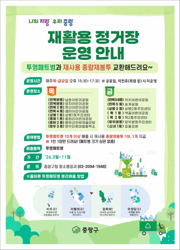서울 중랑구(구청장 류경기)가 11월까지 매주 목요일과 금요일 오후 3시 30분부터 5시 30분까지 투명페트병 분리배출 활성화를 위한 재활용 정거장을 운영한다.