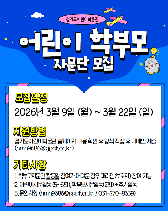 이번 자문단 모집은 2026년 3월 9일(월)부터 3월 22일(일)까지 진행된다. 신청 대상은 경기도에 거주하는 초등학교 3~5학년 어린이와 보호자이며, 선발된 자문단은 2026년 한 해 동안 박물관의 전시·교육·행사 등 주요 사업의 기획 단계에서 사전 체험과 의견 제시를 통해 실제 운영에 참여하게 된다. 참여를 희망하는 어린이와 학부모는 경기도어린이박물관 홈페이지를 통해 신청할 수 있다.