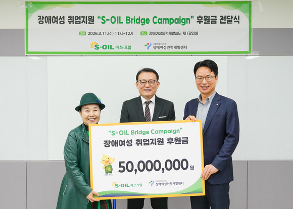 에쓰오일(S-OIL)이 11일 서울 강서구 장애여성인력개발센터에서 장애 여성의 취업과 자립을 지원하기 위한 ‘S-OIL Bridge Campaign(브리지 캠페인)’ 후원금 5000만원을 전달했다.