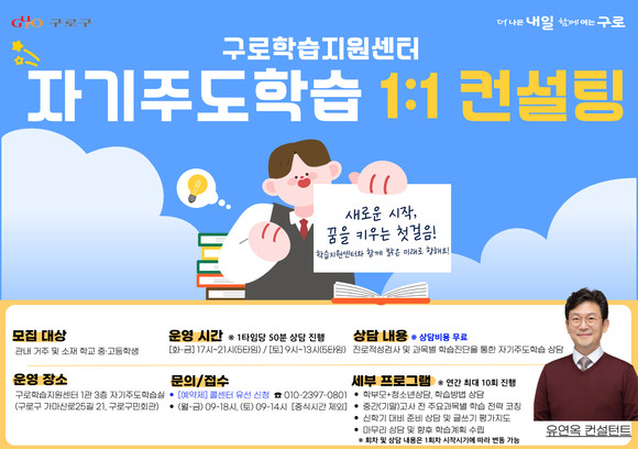 상담은 구로학습지원센터 1관 3층 ‘자기주도학습실’에서 구로구 거주 또는 소재 학교에 재학 중인 중·고등학생 100명을 대상으로 진행되며, 예비 중학교 1학년(초등학교 6학년) 학생도 참여할 수 있다.