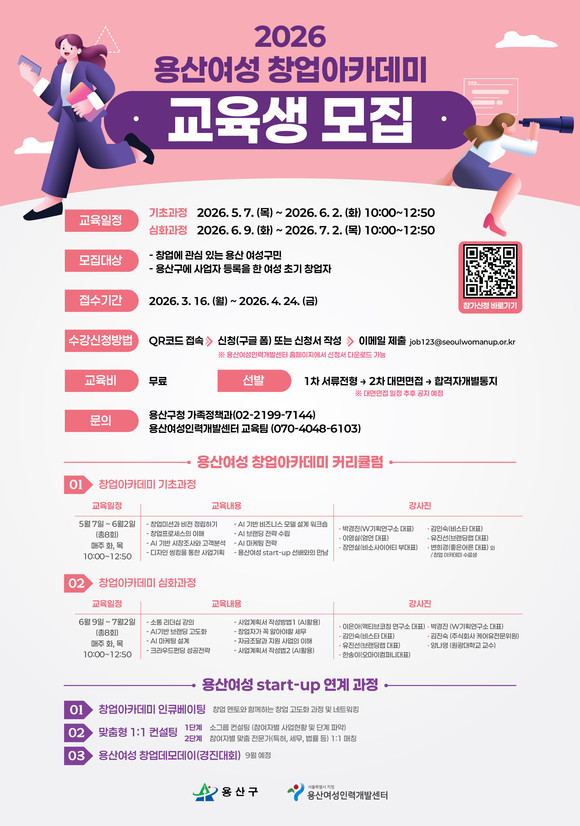 수강생 모집은 3월 16일부터 4월 24일까지다. 창업에 관심 있는 용산구 여성 구민과 예비 여성창업자 누구나 신청할 수 있으며, 모집 인원은 25명이다. 정보무늬(QR코드)를 통해 구글폼으로 신청하거나, 용산여성인력개발센터 누리집에서 신청서를 내려받아 작성한 뒤 전자우편으로 제출하면 된다.
