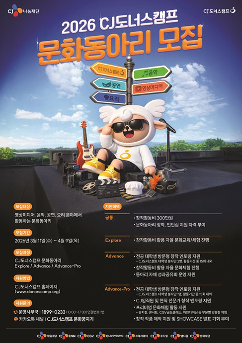CJ도너스캠프가 ‘2026 CJ도너스캠프 문화동아리’ 참가팀을 다음달 9일까지 모집한다고 18일 밝혔다.