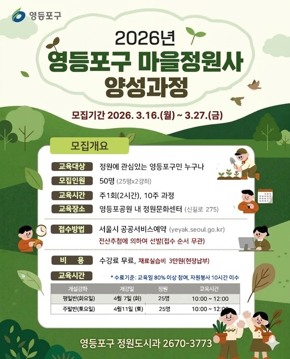 서울 영등포구(구청장 최호권)가 ‘정원도시 영등포’를 함께 가꾸어 갈 ‘2026년 상반기 영등포구 마을정원사 양성과정’ 수강생을 모집한다고 밝혔다.