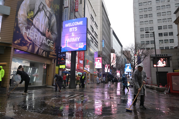 서울 중구(구청장 김길성)는 지난 18일 명동 거리에 설치된 미디어 폴에 BTS 환영 영상을 송출하고, 거리 물청소를 실시했다.
