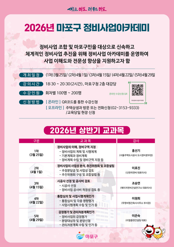 서울 마포구(구청장 박강수)는 지역 내 정비사업 조합과 주민을 대상으로 ‘2026년 상반기 마포구 정비사업 아카데미’를 3월 25일부터 4월 29일까지 총 5회차에 걸쳐 개최한다.
