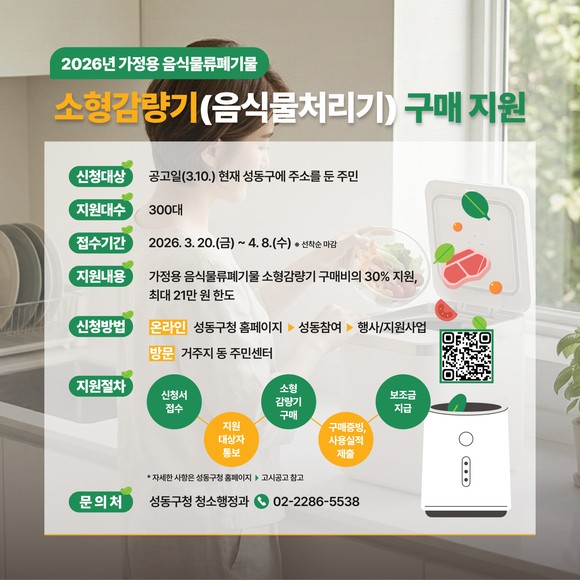 올해는 소형 감량기 구매비용의 30%, 가구당 최대 21만 원까지 총 300세대를 대상으로 보조금을 지원할 예정이다. 신청 기간은 3월 20일부터 4월 8일까지 선착순으로, 거주지 동주민센터 방문 또는 성동구청 누리집(홈페이지) 신속 예약을 통해 신청할 수 있다.