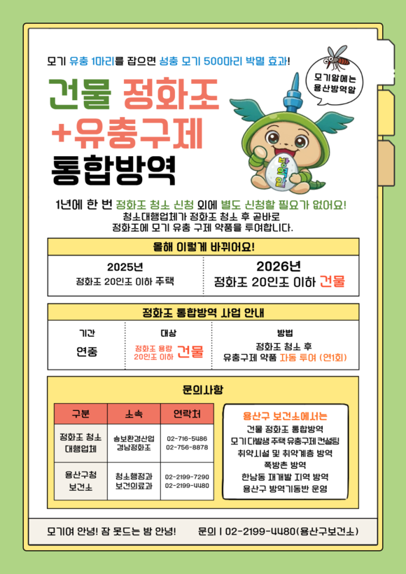 기존 방역 사업도 확대 운영된다. ‘정화조 유충구제 통합방역 서비스’는 별도 신청 없이 정화조 청소 시 유충구제 약품을 함께 투여하는 방식으로 운영되며, 올해부터는 지원 대상을 정화조 용량 20인조 이하 건물까지 확대해 방역 사각지대를 줄인다.