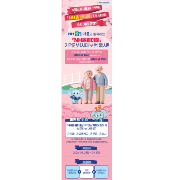 이번 이벤트는 최근 출시한 ‘NH올원더풀기억안심치매보험’을 주제로 한 퀴즈 형태로 구성했으며, 상품 가입 여부와 관계없이 누구나 참여할 수 있다.