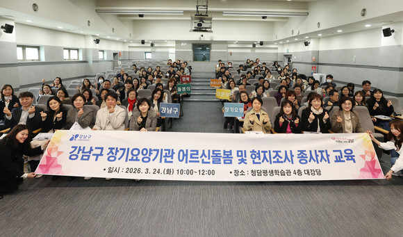 서울 강남구(구청장 조성명)가 3월 24일 청담평생학습관에서 관내 재가장기요양기관장과 종사자 130여 명이 참석한 가운데 ‘2026년 장기요양기관 어르신 돌봄 및 부당청구 예방 교육’을 실시했다.