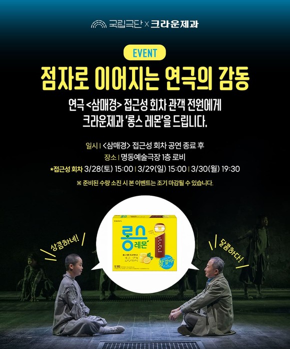 국립극단(단장 겸 예술감독 박정희) 연극 <삼매경>이 오는 28일부터 30일까지 진행되는 접근성 회차에 극장을 찾는 모든 관객에게 점자 과자를 선물한다. 크라운제과(대표이사 윤석빈)의 협찬으로 패키지에 제품명과 소비기한, 과자 위에 메세지가 점자로 새겨진 초코케이크 ‘롱스 레몬’을 티켓 1매당 1케이스씩 제공한다.