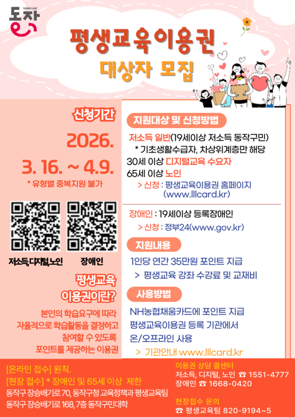동작구, 2026년 평생교육이용권 지원사업 대상자 모집 홍보 포스터. 이미지=동작구청