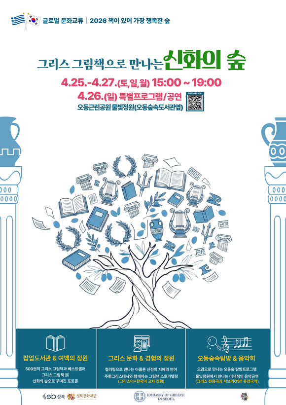 행사장 전역에는 ▲500여 권의 도서를 갖춘 ‘팝업도서관’ ▲숲속에서 감상하는 ‘그리스 그림책展’ ▲신화 속 장면을 재현한 ‘포토존’이 운영된다. 특히 고대 그리스 아폴론 신전의 델픽 격언을 배우는 ‘지혜의 언어 컬러링’과 ‘그리스 알파벳 스탬프 체험’은 어린이들이 고대 그리스 문화를 친숙하게 접할 수 있는 기회를 제공할 예정이다.