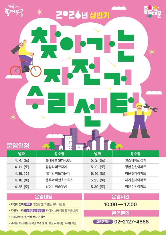 서울 동대문구(구청장 이필형)는 자전거 이용을 활성화하고 친환경 교통문화를 확산하기 위해 4월부터 ‘2026 찾아가는 수리센터’를 본격 운영한다고 밝혔다.