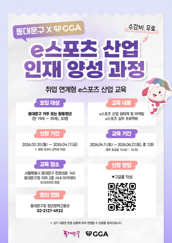 이필형 동대문구청장은 “이번 교육 프로그램이 청년들이 e스포츠 산업 분야에 대해 기초부터 실습까지 체계적으로 배울 수 있고, 취업 역량 강화에도 도움이 되기를 기대한다”고 말했다.