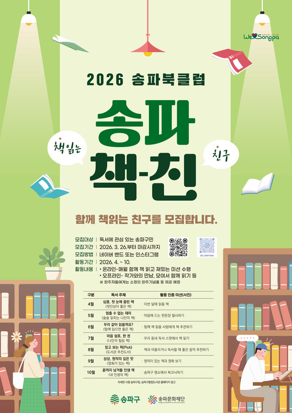 서울 송파구는 독서문화 확산을 위해 4월부터 10월까지 7개월간 ‘2026 송파북클럽-송파 책-친’을 운영한다.