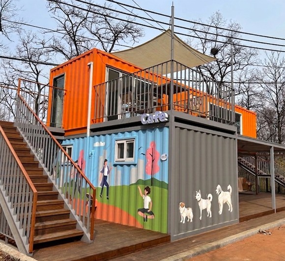 ‘천연 황토 행복 카페’는 지상 2층 규모의 컨테이너 구조로 주변 경관과 조화롭게 설계됐다. 1층에는 카페와 공중화장실을 배치해 이용객 편의를 극대화하고 커피와 차, 반려견 간식, 서대문구 굿즈 등을 판매한다.