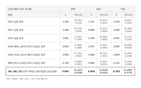 또한 근육량과 근력, 신체 기능이 저하된 ‘심한 근감소증’ 단계에서 우울감을 느낄 위험이 정상 노인에 비해 남성은 3.62배, 여성은 3.33배까지 높아지는 것으로 확인됐다.