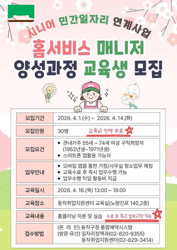 지원 대상은 동작구에 거주하는 55세부터 74세까지(1952년생~1971년생)의 구직 희망 여성 30명이며, 모집 기간은 4월 1일부터 14일까지다.