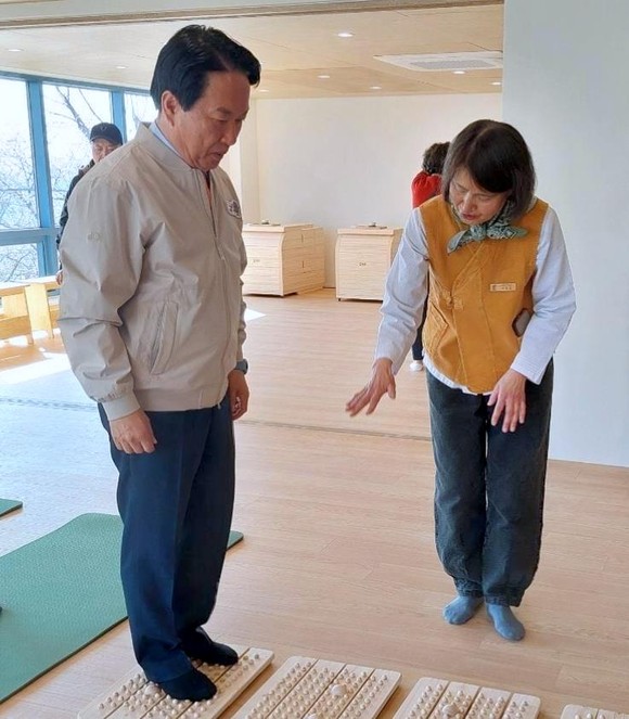 이성헌 서대문구청장이 백련산 숲속치유센터에서 편백 발지압기 체험을 하고 있다. 사진=서대문구청