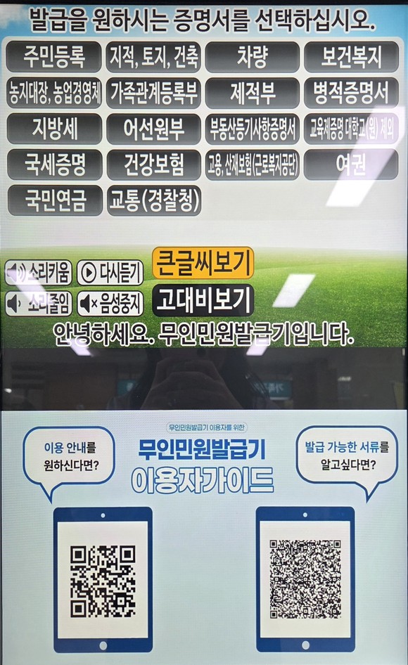 ‘큐알(QR)코드 모바일 가이드’는 기기 화면에 표시된 큐알(QR)코드를 스마트폰의 카메라로 읽으면 발급받을 수 있는 서류의 목록을 한눈에 확인하고, 맞춤형 발급 안내도 받을 수 있다.