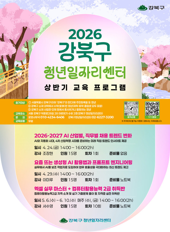신청은 포스터에 안내된 큐알(QR)코드를 통해 가능하며, 교육 과정 및 일정 등 자세한 사항은 강북구 청년일자리센터로 문의하거나 강북구청 홈페이지(강북소개>강북소식>새소식)을 참고하면 된다.