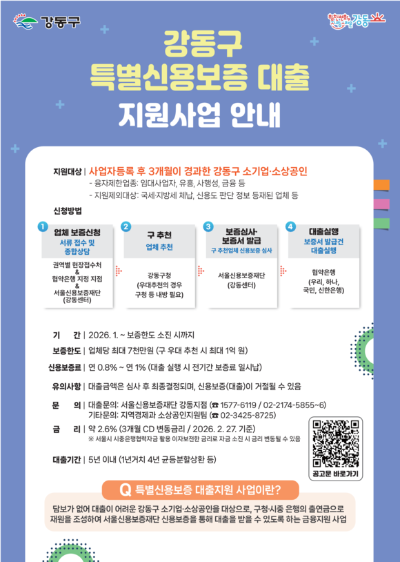 현재 현장 접수처 운영은 종료됐지만, 강동구 소상공인은 서울신용보증재단 강동종합지원센터 또는 4개 협력 은행(국민·신한·우리·하나) 관내 영업점을 통해 보증 한도 소진 시까지 특별신용보증 대출을 신청할 수 있다.
