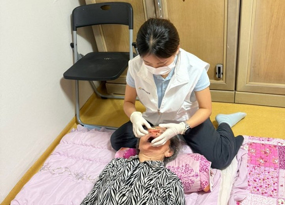 다학제팀(치과위생사)이 방문해 어르신을 대상으로 구강건강관리를 진행하고 있다. 사진=금천구청