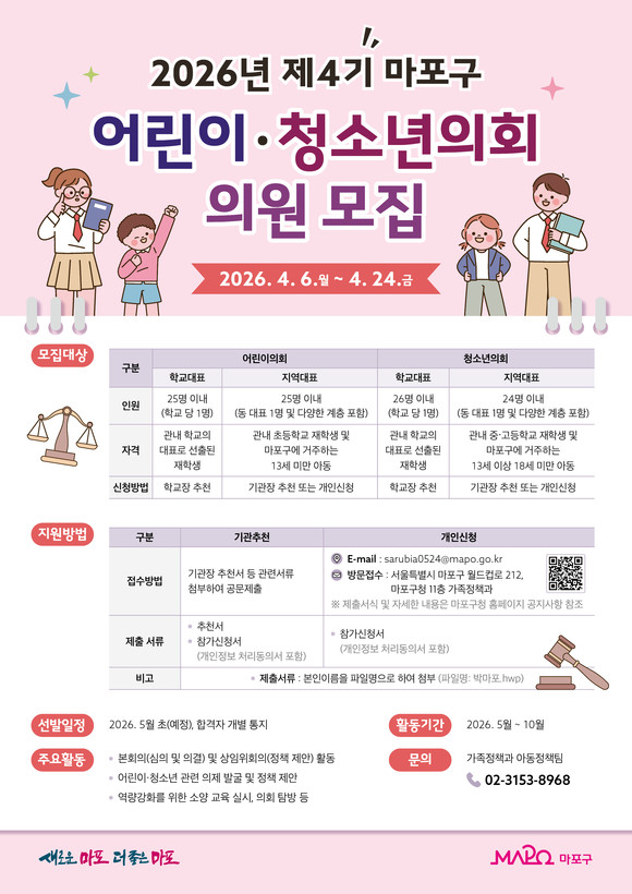 서울 마포구(구청장 박강수)는 4월 6일부터 24일까지 ‘제4기 어린이·청소년의회’ 위원을 모집한다.