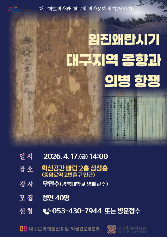 (재)대구문화예술진흥원 박물관운영본부 소속 대구향토역사관은 2026년 대구시민주간 연계 프로그램으로 ‘임진왜란시기 대구지역 동향과 의병 항쟁’을 주제로 4월 17일(금) 2시에 전문가 특강을 개최한다.
