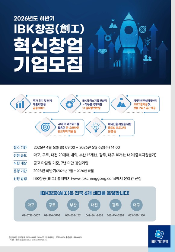 IBK기업은행의 창업육성 플랫폼 ‘IBK창공(創工)’이 2026년 하반기 혁신창업기업 모집을 진행한다.