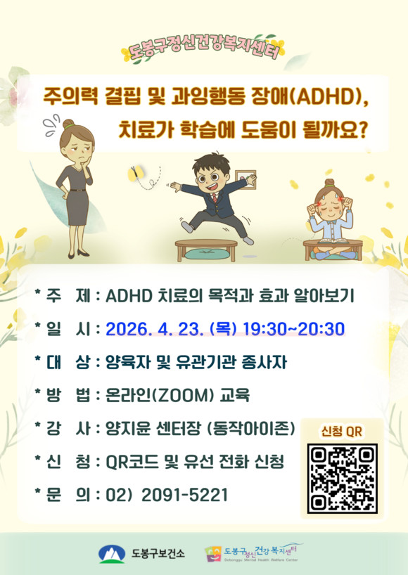 서울 도봉구(구청장 오언석)가 오는 4월 23일 오후 7시 30분 아동‧청소년 보호자와 관계 기관 종사자를 대상으로 주의력결핍 과잉행동장애(ADHD) 온라인 교육(ZOOM)을 진행한다.