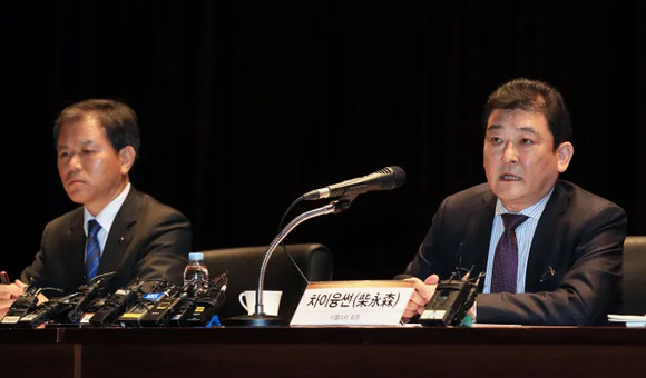 2018년 3월 22일 오전 금호타이어 인수를 추진하는 중국 타이어업체 더블스타의 차이융썬 회장(오른쪽)이 서울 여의도 산업은행 본점에서 열린 방한 기자회견에서 취재진의 질문에 답하고 있다. 왼쪽은 이대현 산은 수석부행장. 사진=연합뉴스