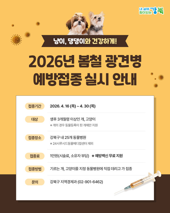 서울 강북구는 반려동물과 구민의 건강을 보호하기 위해 4월 16일부터 30일까지 ‘2026년 봄철 광견병 예방접종’을 실시한다고 밝혔다.