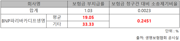 BNP파리바카디프생명 관계자는 “부지급률과 소송제기비율 모두 전체 건수가 많지 않아 한 건만 발생해도 비율이 상승할 수 있다”며 “실제 건수는 타사 대비 낮은 수준”이라고 말했다.