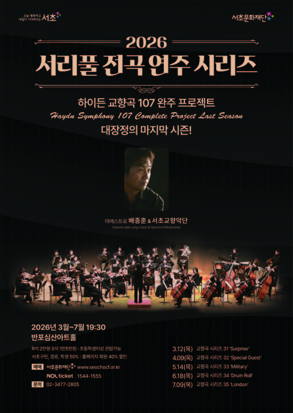 전성수 서초구청장은 “하이든 교향곡 전곡 연주는 서초 문화예술 자산이 빚어낸 뜻깊은 결실”이라며 “앞으로도 서초의 문화예술 역량을 바탕으로 구민의 일상 속 품격 있는 공연 문화를 넓혀가겠다”고 밝혔다.