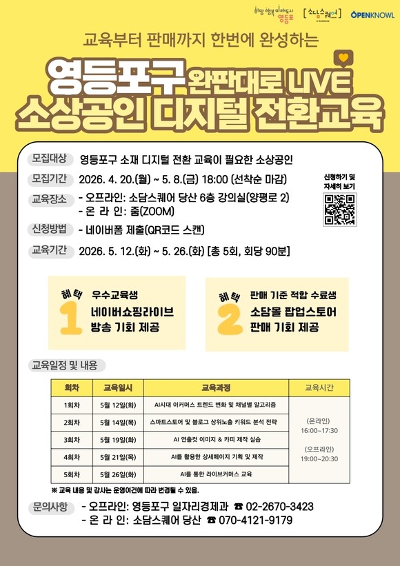 교육은 영등포구 소재 소상공인을 대상으로 5월 12일부터 26일까지 총 5회에 걸쳐 온·오프라인으로 동시에 진행되며, 오프라인 교육은 소담스퀘어 당산(양평로 2) 6층 강의실에서 진행된다.