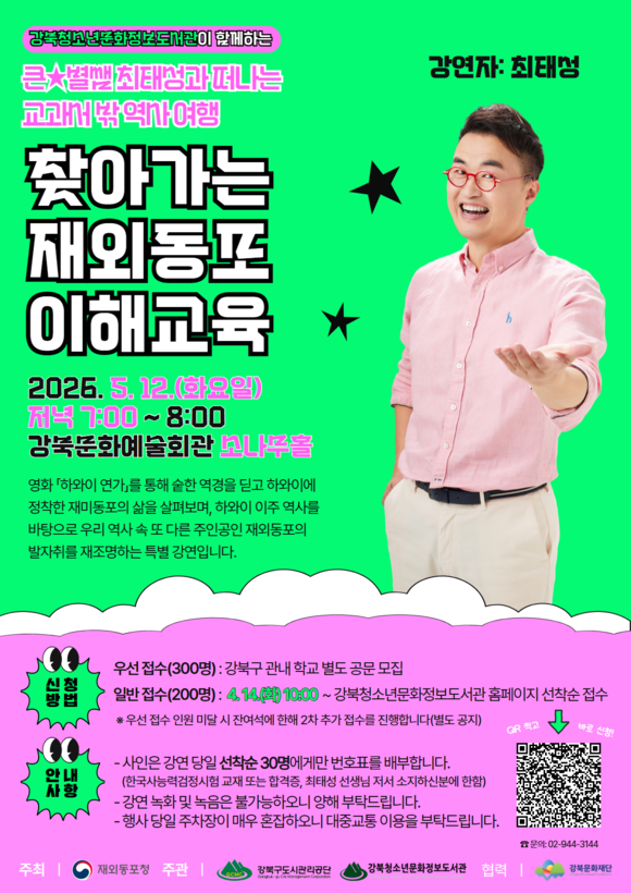 이번 강연은 재외동포청이 주최한 공모사업에 강북청소년문화정보도서관이 선정되면서 마련됐다. 재외동포청 홍보대사이자 ‘큰별쌤’으로 알려진 역사 강사 최태성이 강연자로 나서, 재외동포의 역사에 대한 올바른 이해를 돕고 긍정적인 인식을 확산할 예정이다.