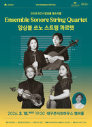 대구콘서트하우스는 2026 DCH 앙상블 페스티벌의 일환으로, 지역 클래식 음악계를 대표하는 앙상블 쏘노 스트링 콰르텟 공연을 오는 3월 18일(수) 오후 7시 30분 챔버홀에서 개최한다.이번 공연은 대구 출신 연주자들로 구성된 앙상블 쏘노 스트링 콰르텟의 무대다. 2013년 부부 바이올리니…